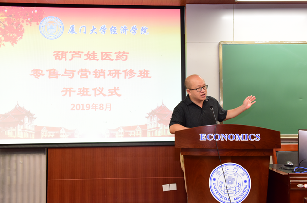 在开班仪式上,廖景峰主任首先代表厦门大学经济学院热烈欢迎钱柜QG777医药零售与营销研修班的学员到厦大学习,并就厦门大学及经济学院的相关情况进行了介绍。他说,钱柜QG777学员走进厦大就是厦大的校友,希望未来的日子能够关心、支持母校的发展,多提宝贵意见,同时他也祝大家在厦大学习期间学有所成、学有所获。